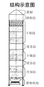主塔結(jié)構(gòu):由儲糧段、干燥段、緩蘇段、干燥段、緩蘇 段、 冷卻段、排糧機構(gòu)組成。